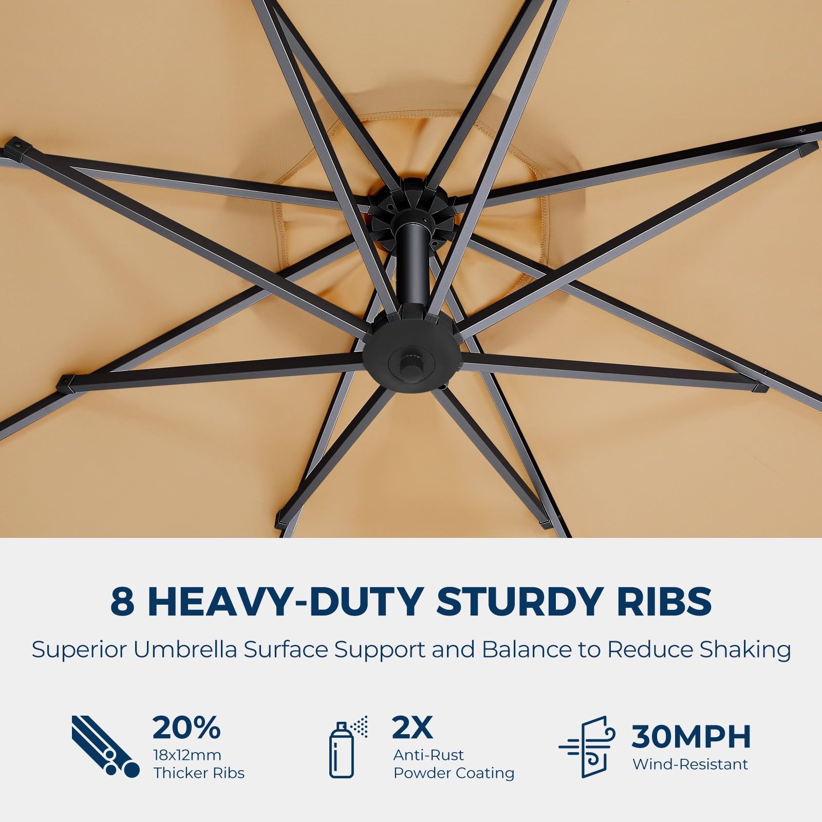 Generous Sunshade: This 10ft offset patio umbrella features a round design and 100% polyester cloth, providing extensive shade for multiple people during outdoor gatherings or relaxation.Robust Stability: Constructed with a 48mm iron pole and 8 strong iron ribs, the umbrella offers a super strong and stable structure, ensuring steadfastness even in windy conditions.Effortless Storage: Convenient Velcro straps allow for quick and easy folding and tying of the umbrella, simplifying organization and saving space for effortless movement or storage.Simple Operation: A user-friendly crank design enables easy one-handed opening, closing, and angle adjustment, allowing for quick response to sunlight changes and comfortable outdoor enjoyment.