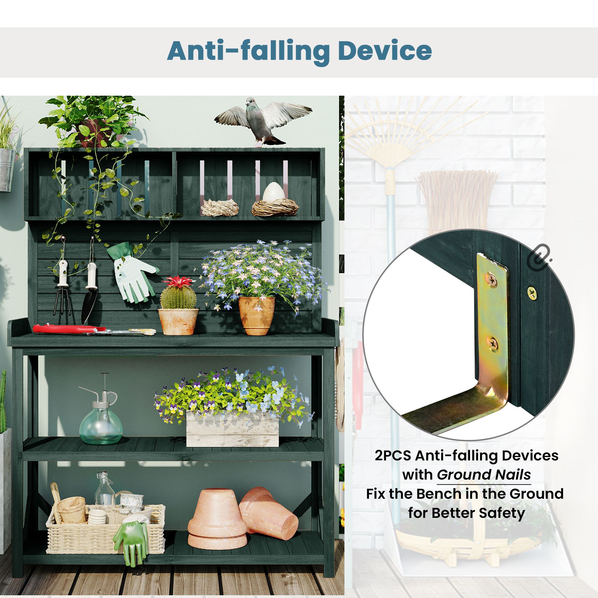 Anti-Falling Safety DeviceThere is not always flat in the garden. For your safety in setting the potting bench; it is designed with an anti-falling device. Just connect the device with wall for better safety. To strength stability; 4 supportive bars are offered to fixed in the lower shelves. They can be fixed in any corner until the table is stable.