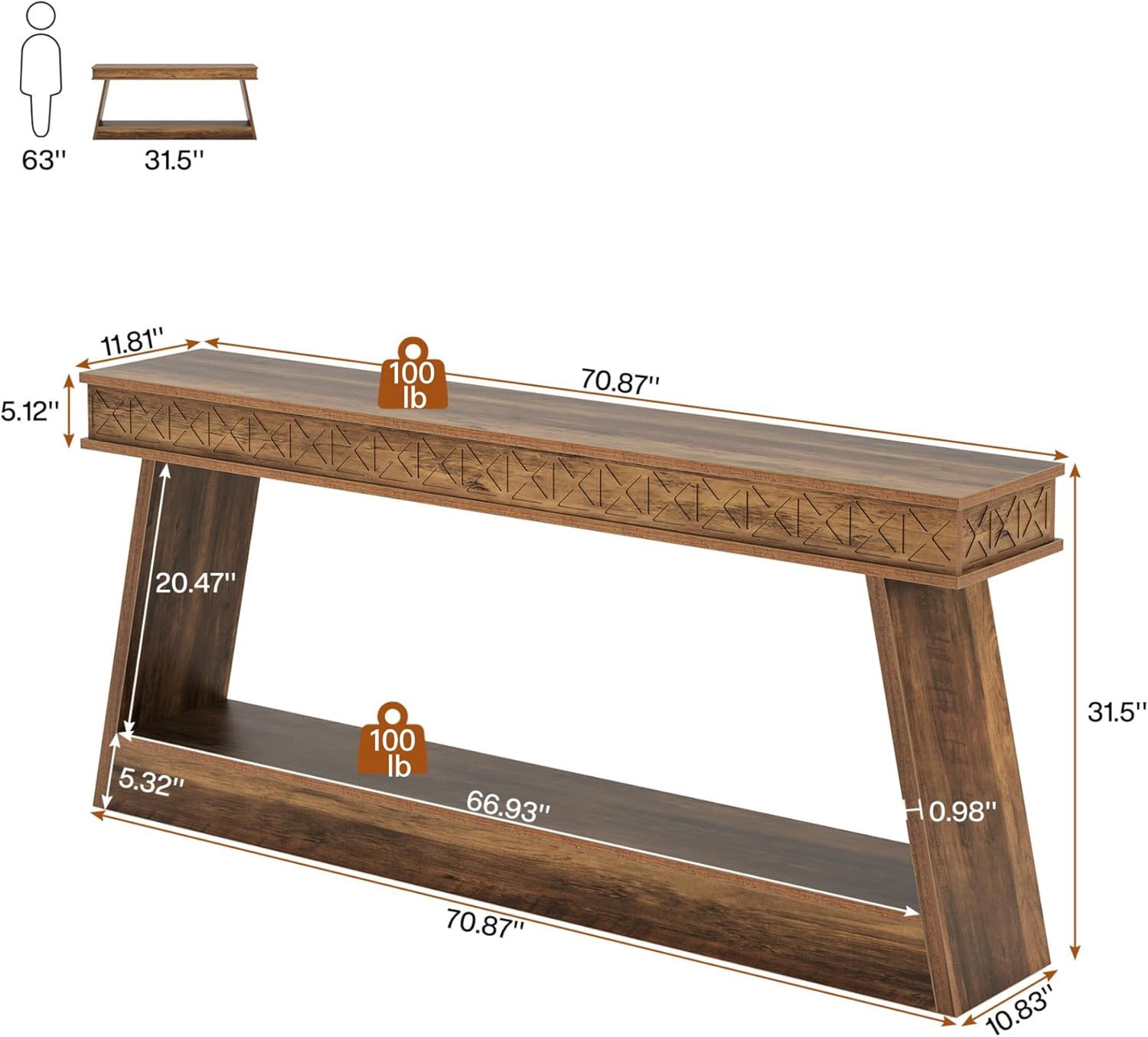 Solid MDF Construction - With a sturdy, 5.12" thick waterproof and scratch-resistant MDF top, this long narrow sofa table stands the test of time. Its 5.32" thick base supports up to 200 lbs and measures 70.87" L x 11.81" W x 31.5" H, providing plenty of surface area. Anti-slip foot pads add stability on uneven surfaces and prevent scratches on floors.